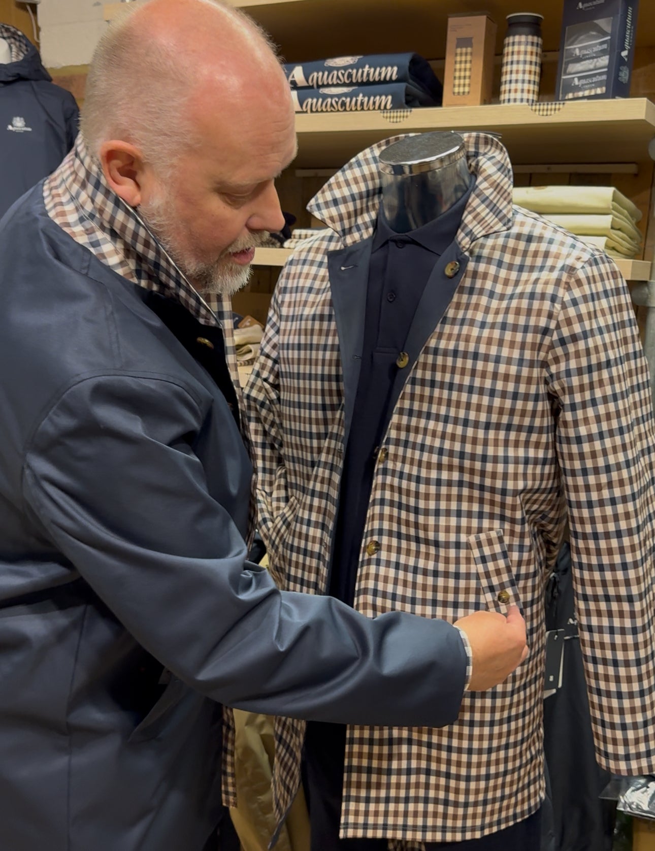 An historic British brand established in 1851 in Regent Street, London. In 1983, they successfully produced a world first 'waterproof wool' blend, and launched Aquascutum. The original Latin translates as 'Water Shield'.