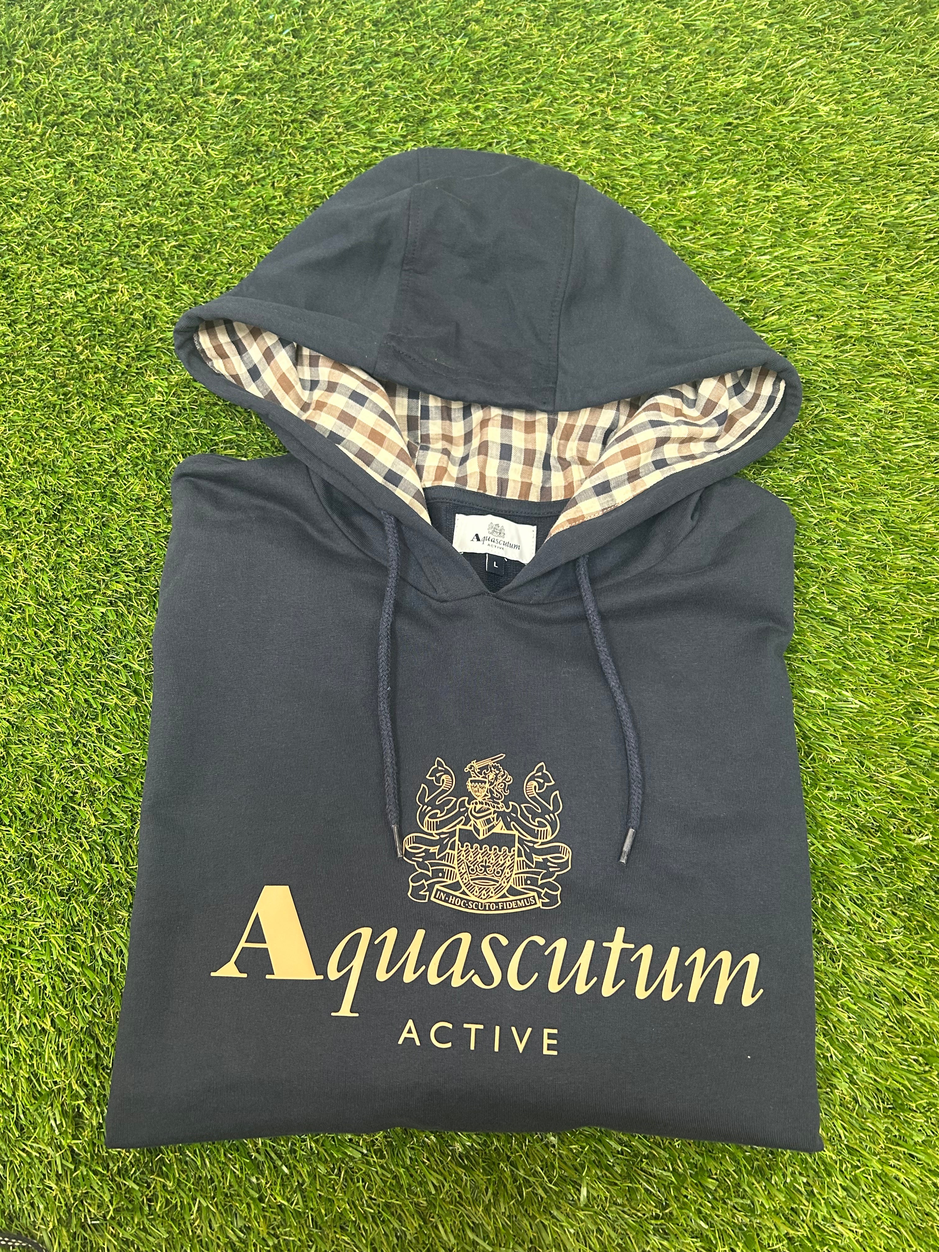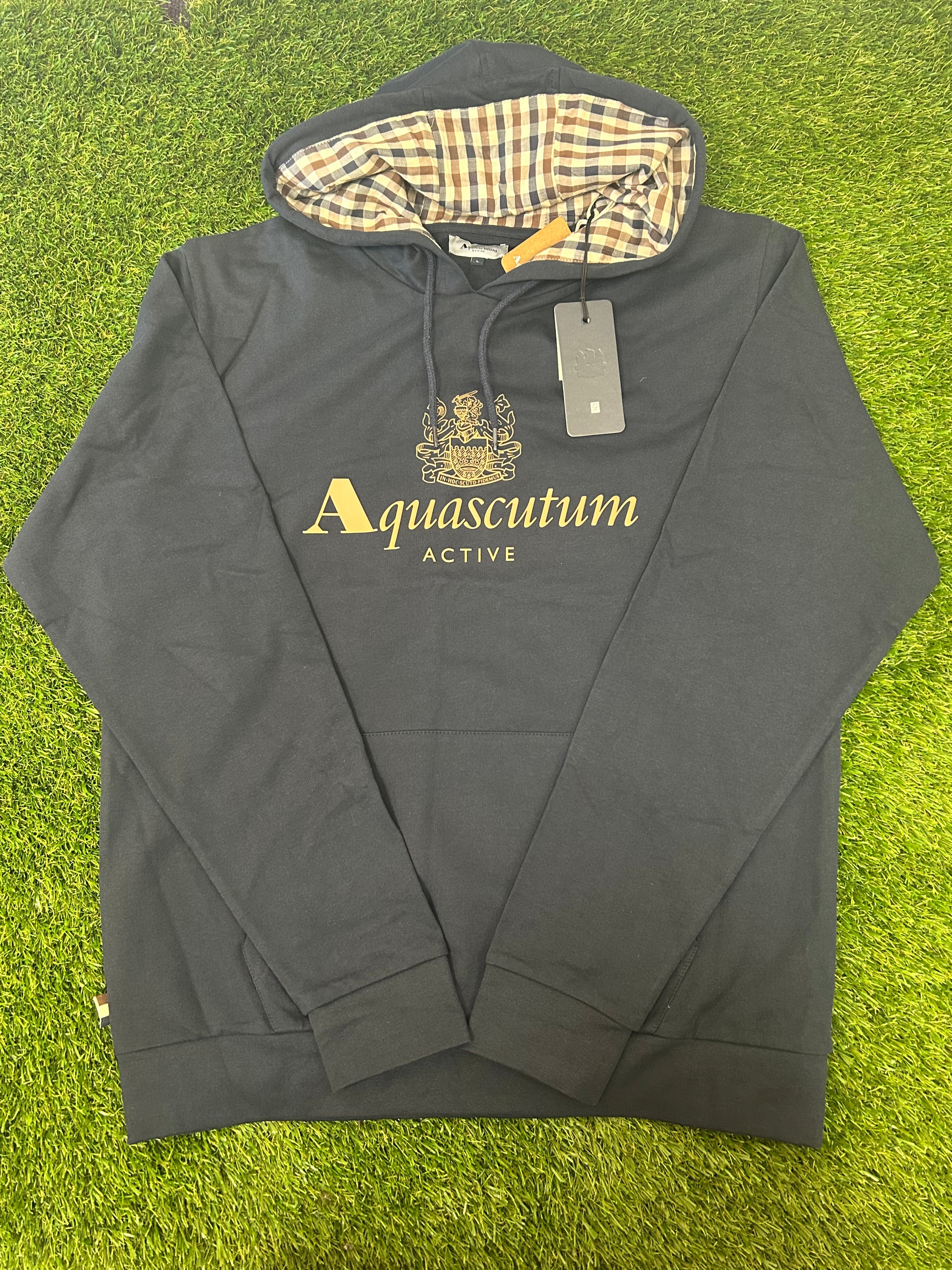 Aquascutum Navy Hoodie, featuring a bold logo across the chest and iconic check-lined hood. This large-sized hoodie offers a drawstring hood and kangaroo pocket for ultimate comfort. Only one available—grab this stylish statement piece at a discount now!