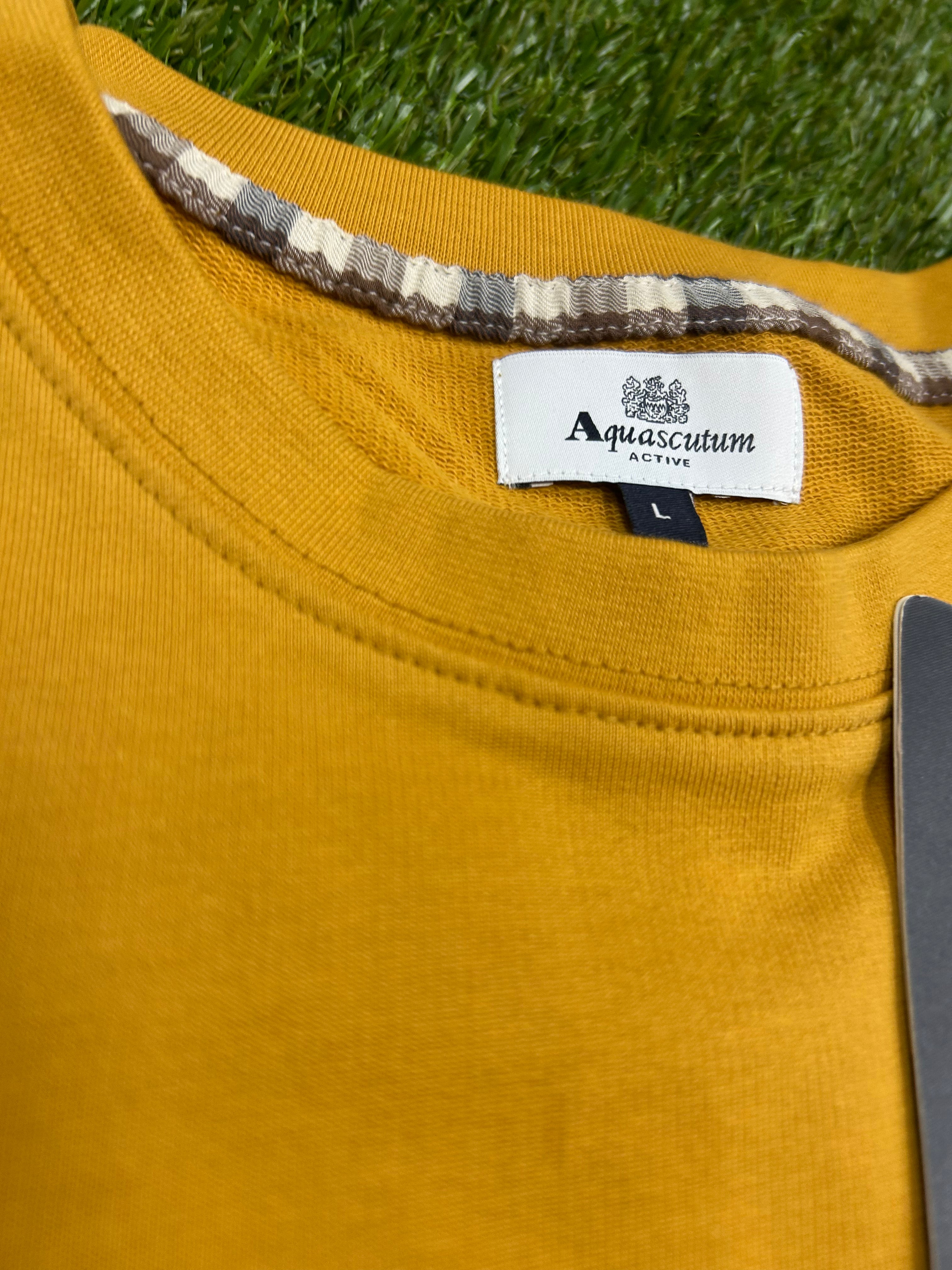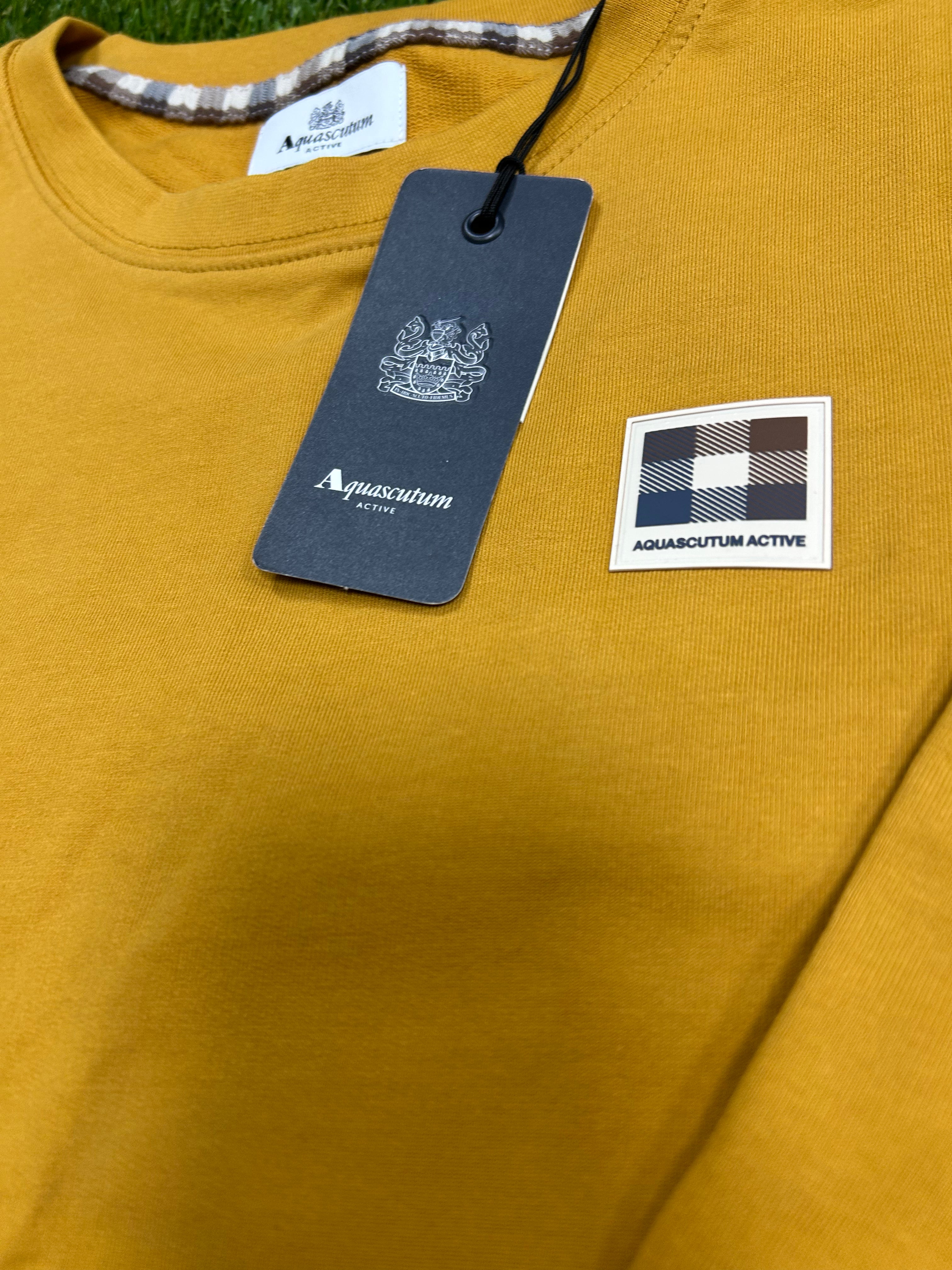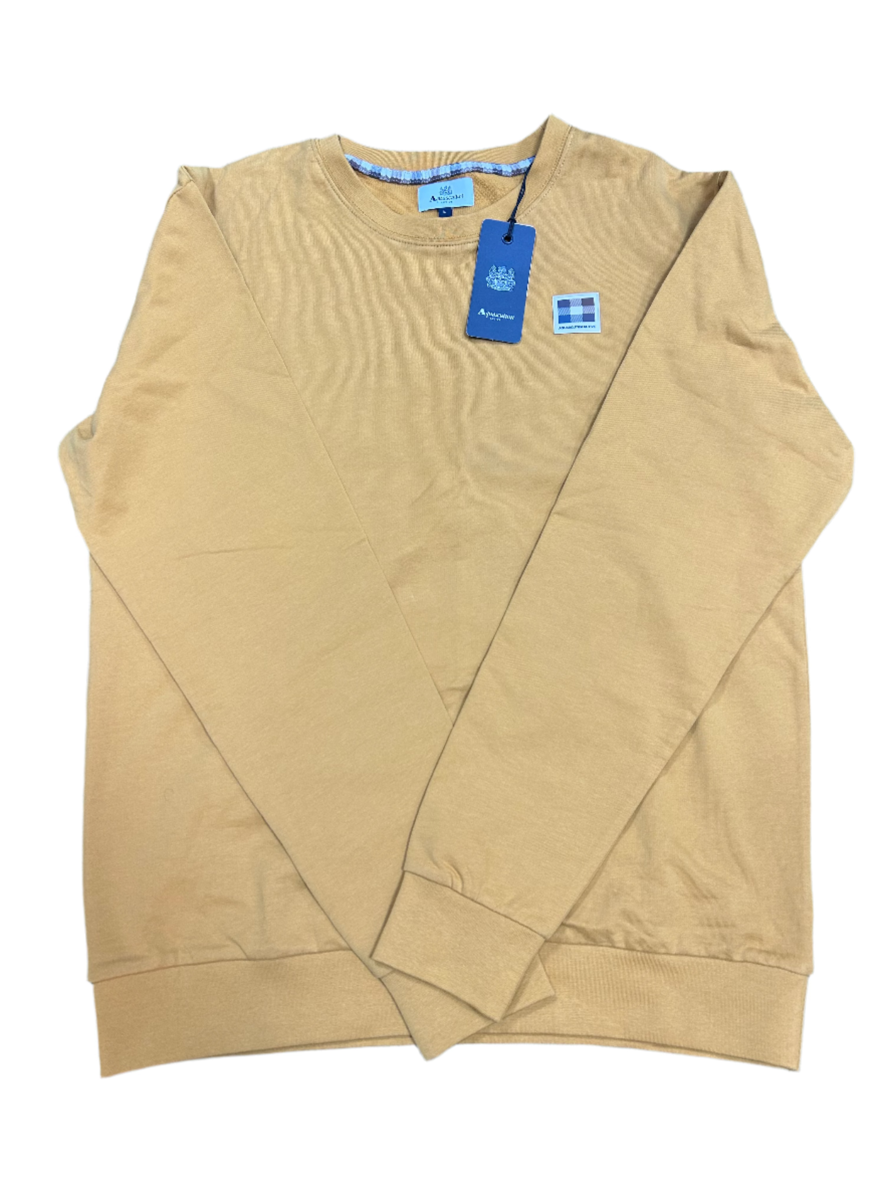 Aquascutum chai tea crewneck jumper in elegant chai tea hue. Features iconic rubber patch logo on chest. Premium, cozy fabric, perfect for stylish comfort.