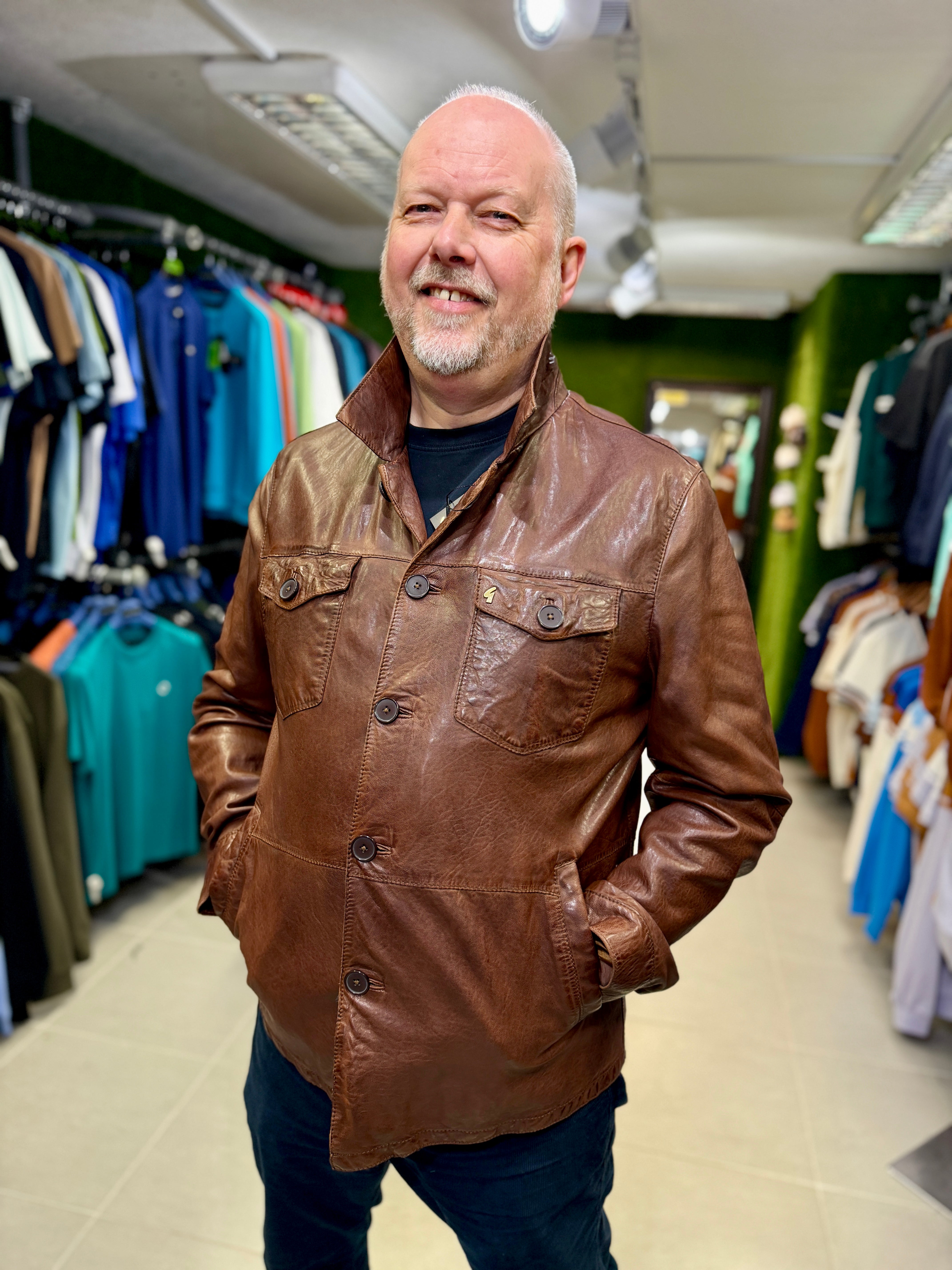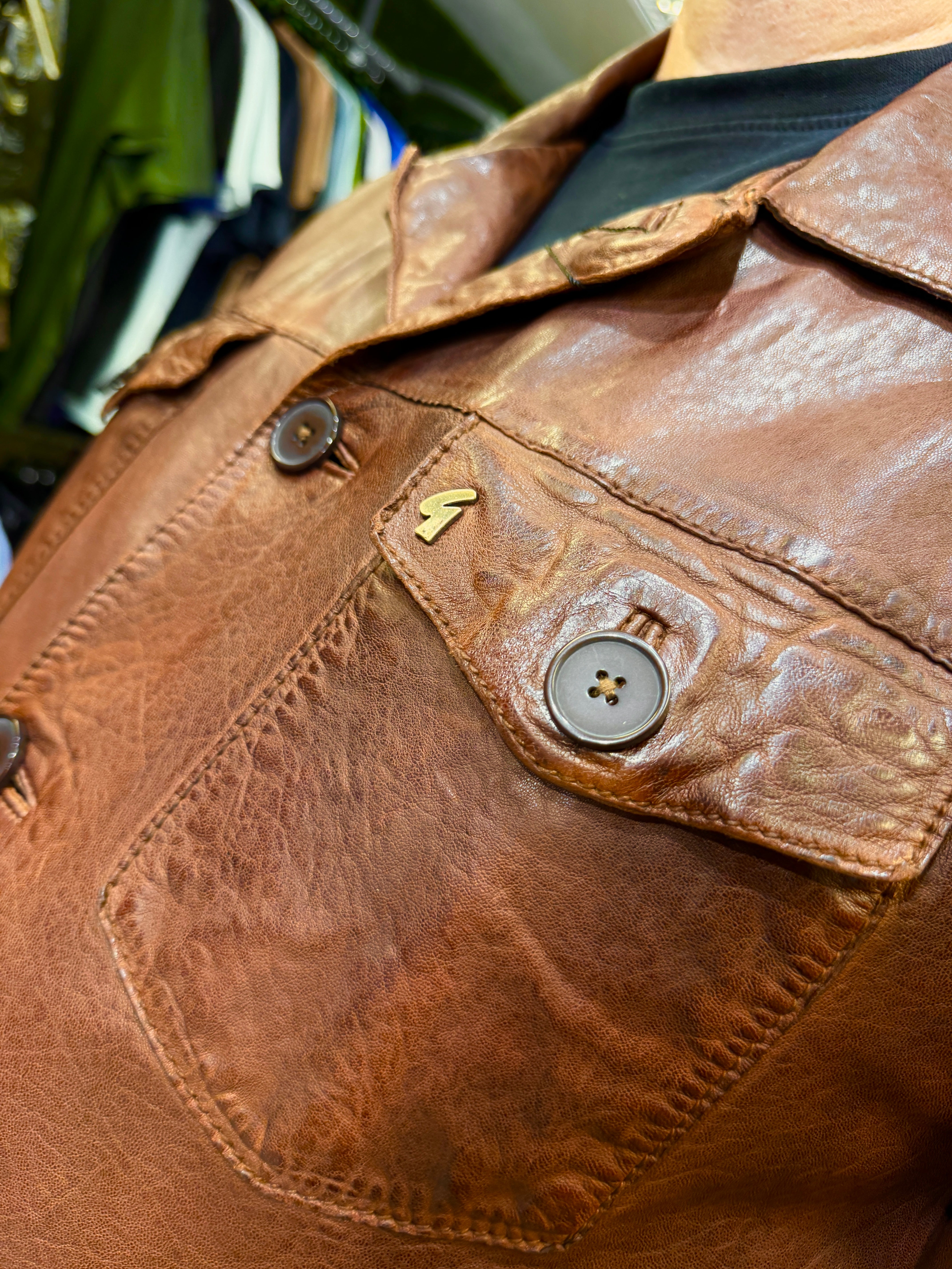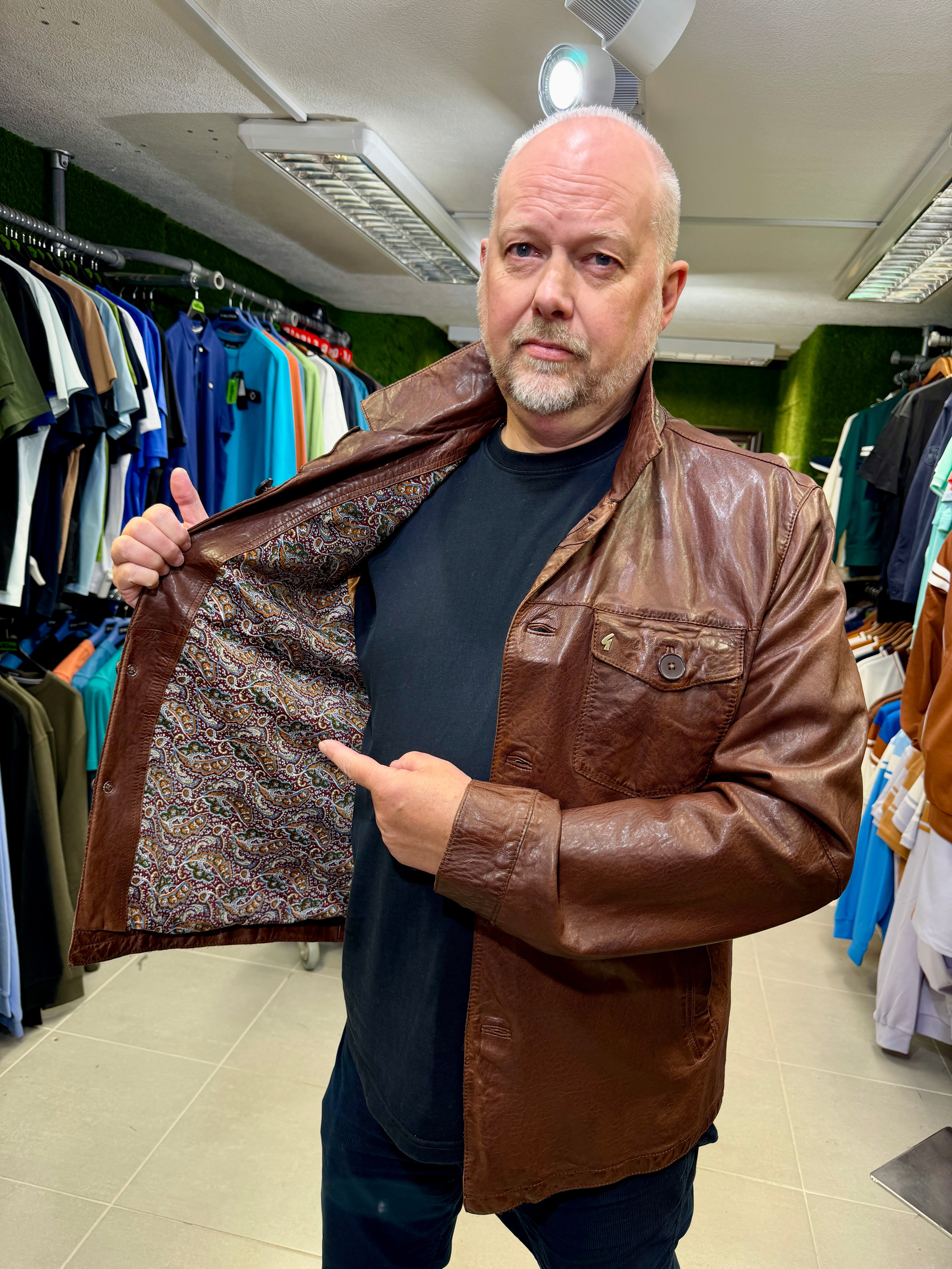 Gabicci Vintage Sam Button-Up Leather Jacket - Brown (Paisley Lining)