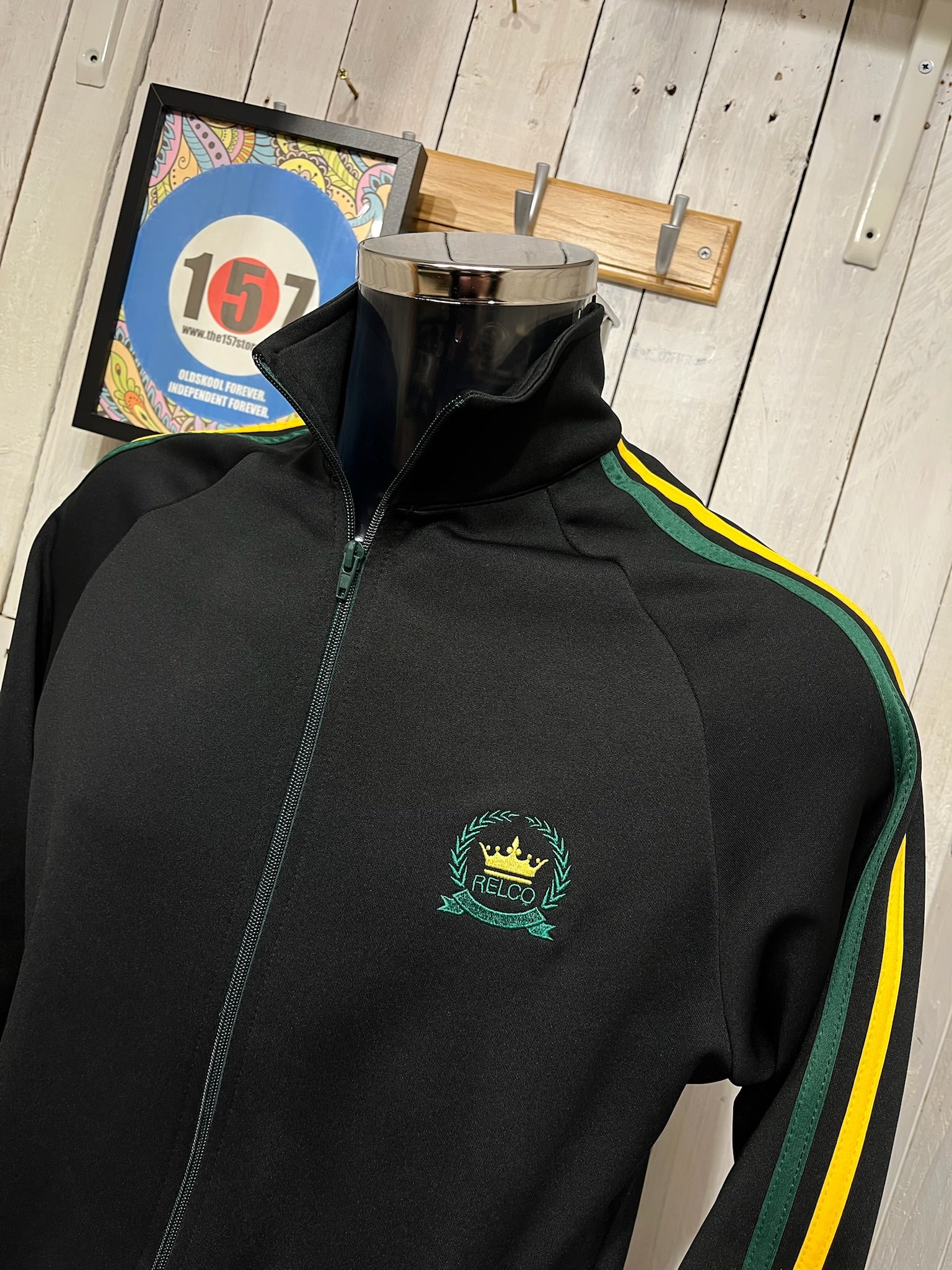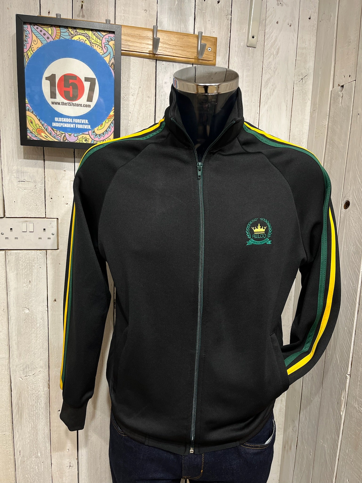 Our classic black track top features bold green and yellow stripe detailing on the sleeves, giving it a retro athletic vibe. Complete with a full zip and the embroidered crown logo.
