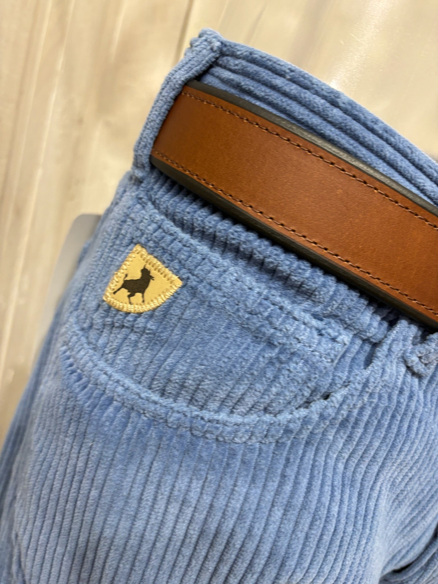 The New Dallas is regular straight leg fit made in jumbo cord. It has a 5 pocket shape with tonal stitching . And features both our signature suede patches on pocket branding and embossed buttons on the fly and branded rivets. The New Dallas is a nod to the 80's.
