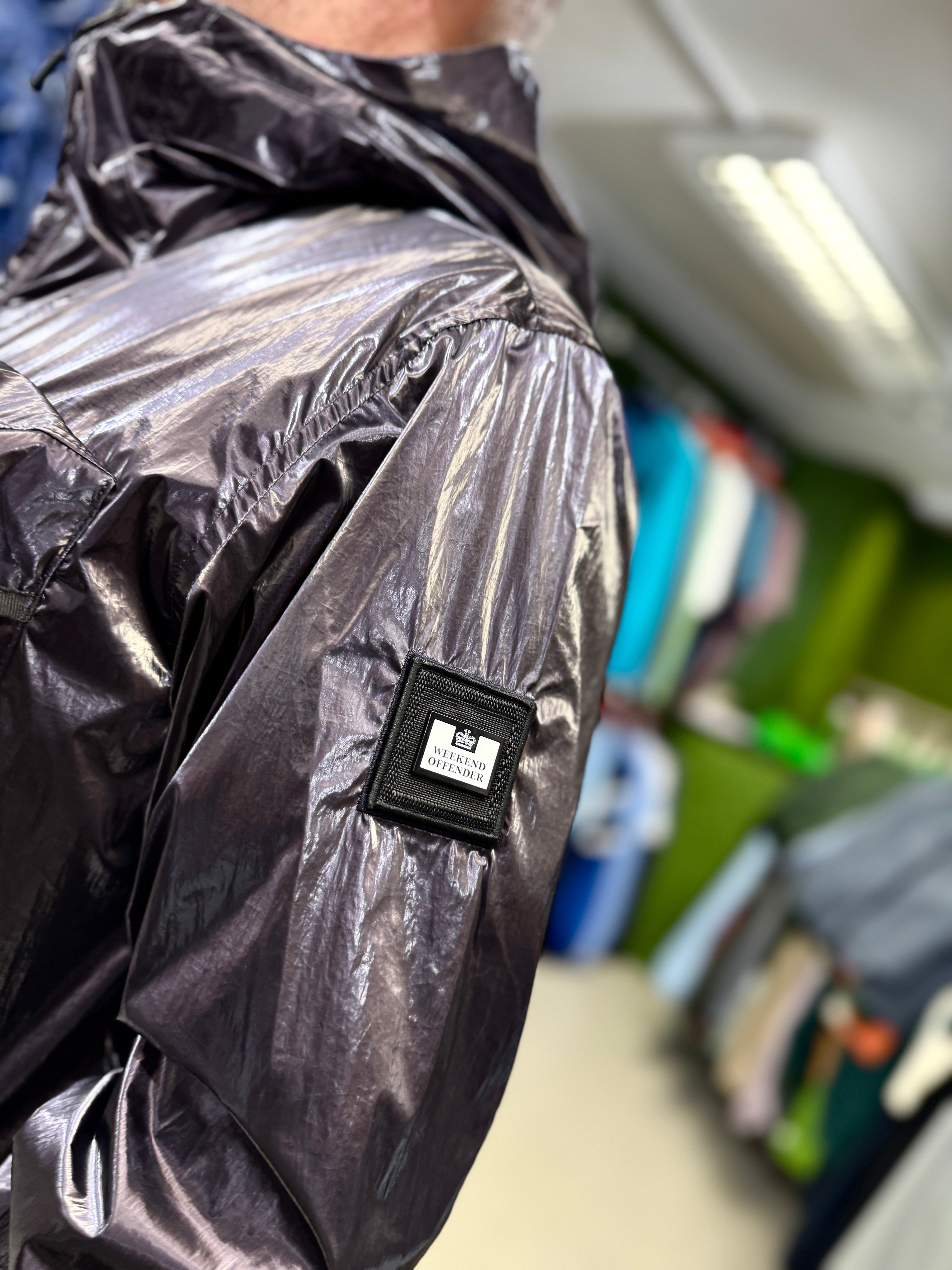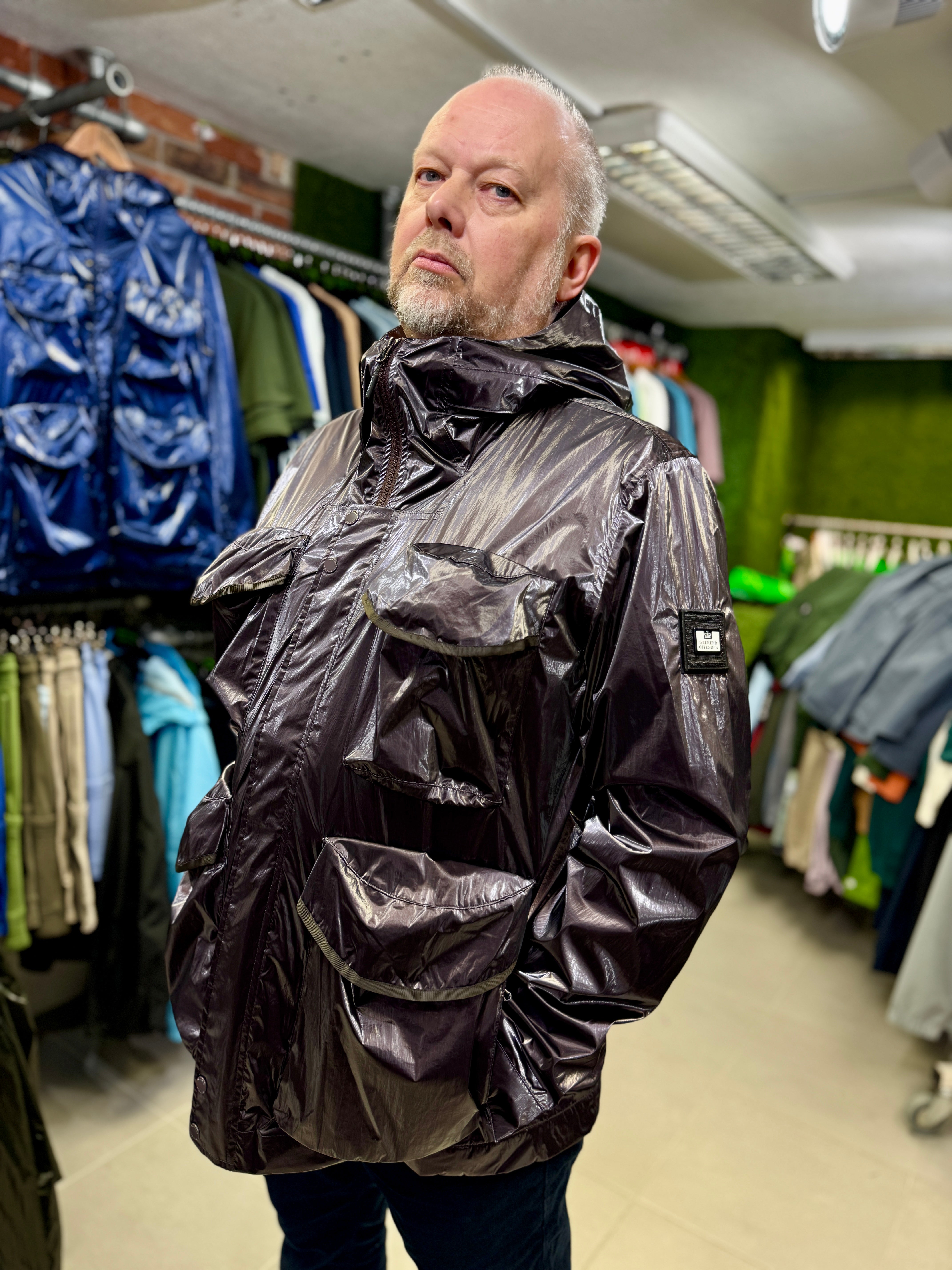 Field jacket made from specially developed ultra-fine weave 100% Nylon treated with a foil coating to give the fabric a frosted metallic appearance. Treated with an additional DWR (Durable Water Repellent) coating.